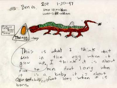 This is what I think what was in the egg when it grew up. I think it is about five to ten feet long. When it is a baby it is about one and a half feet long when it is born